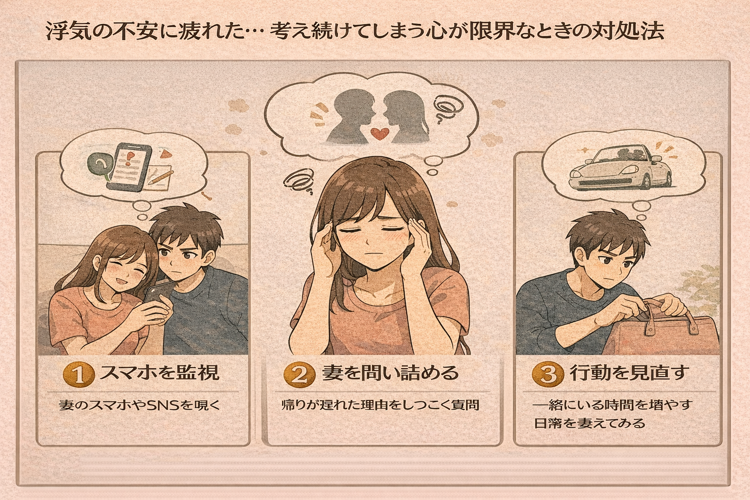 浮気を疑う不安が続き、心も体も疲れていませんか。不安が消えないのは性格ではなく、考え続けてしまう状態が原因です。疑う・信じるの前に立ち止まり、自分の心を守るための考え方と整理の仕方を分かりやすく解説します。
