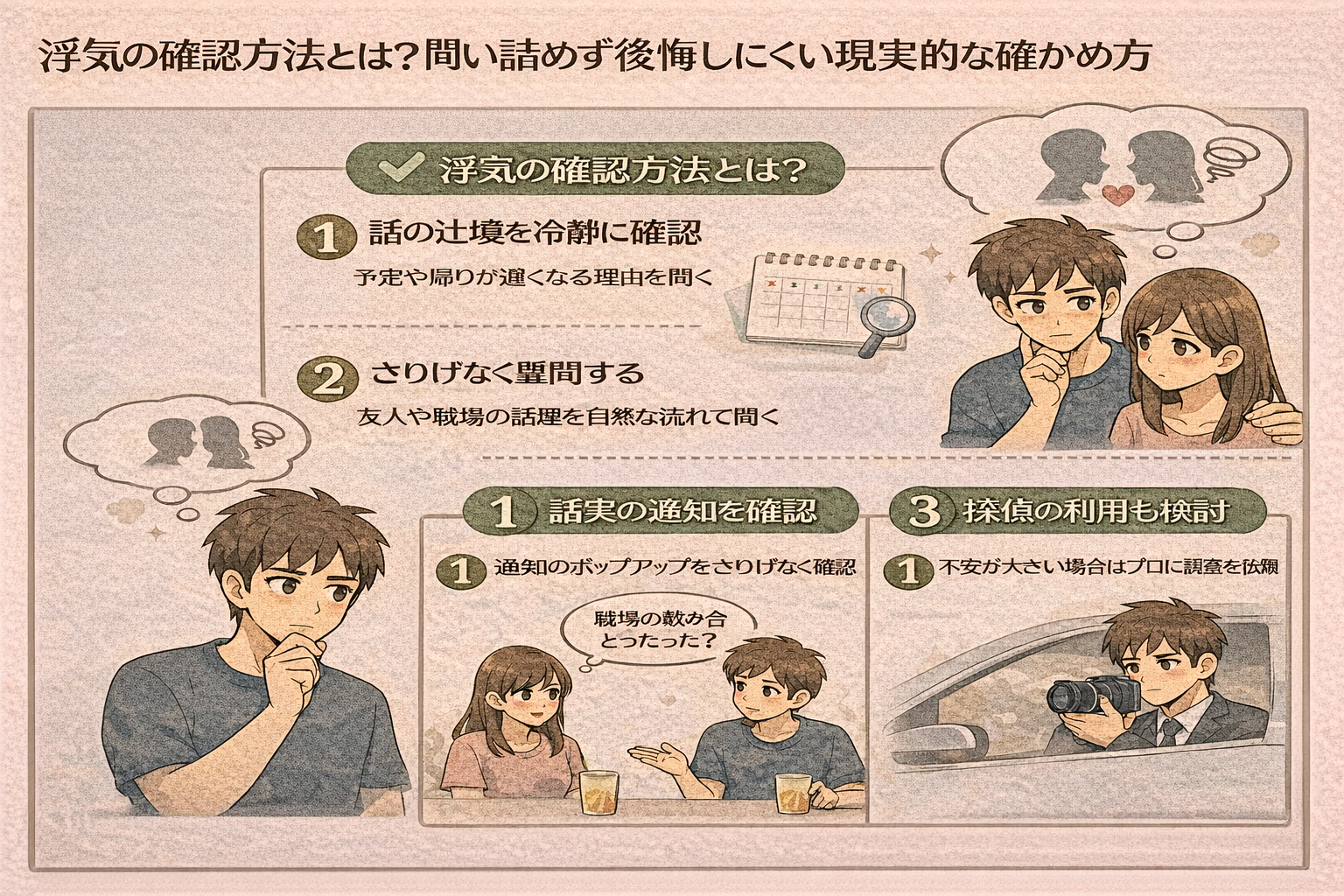 浮気を確認したいときは、感情的に問い詰めるより冷静な方法を選ぶことが大切です。行動の流れや説明の一貫性を見る視点、直接聞く際の伝え方、やってはいけない確認方法まで、後悔しにくい現実的な考え方を解説します。