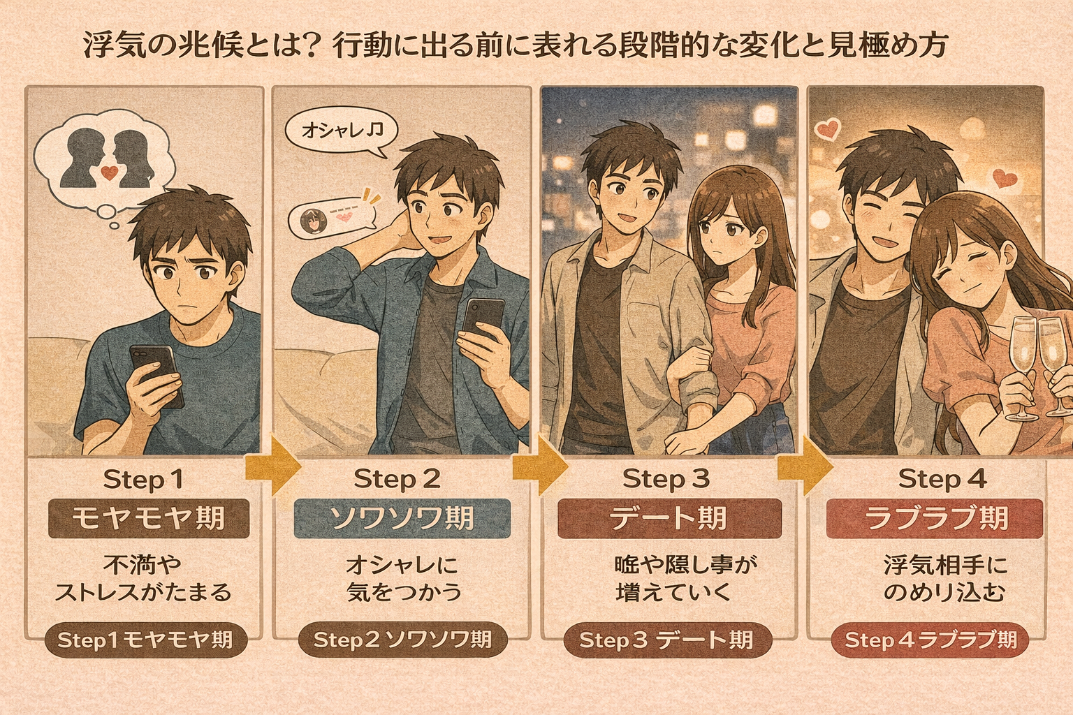 浮気の兆候は突然現れるのではなく、内面の変化から態度、生活リズム、優先順位、防衛的反応へと段階的に表れます。単発ではなく流れとして捉えることで、思い込みを避けつつ冷静に状況を見極めるポイントを分かりやすく解説します。