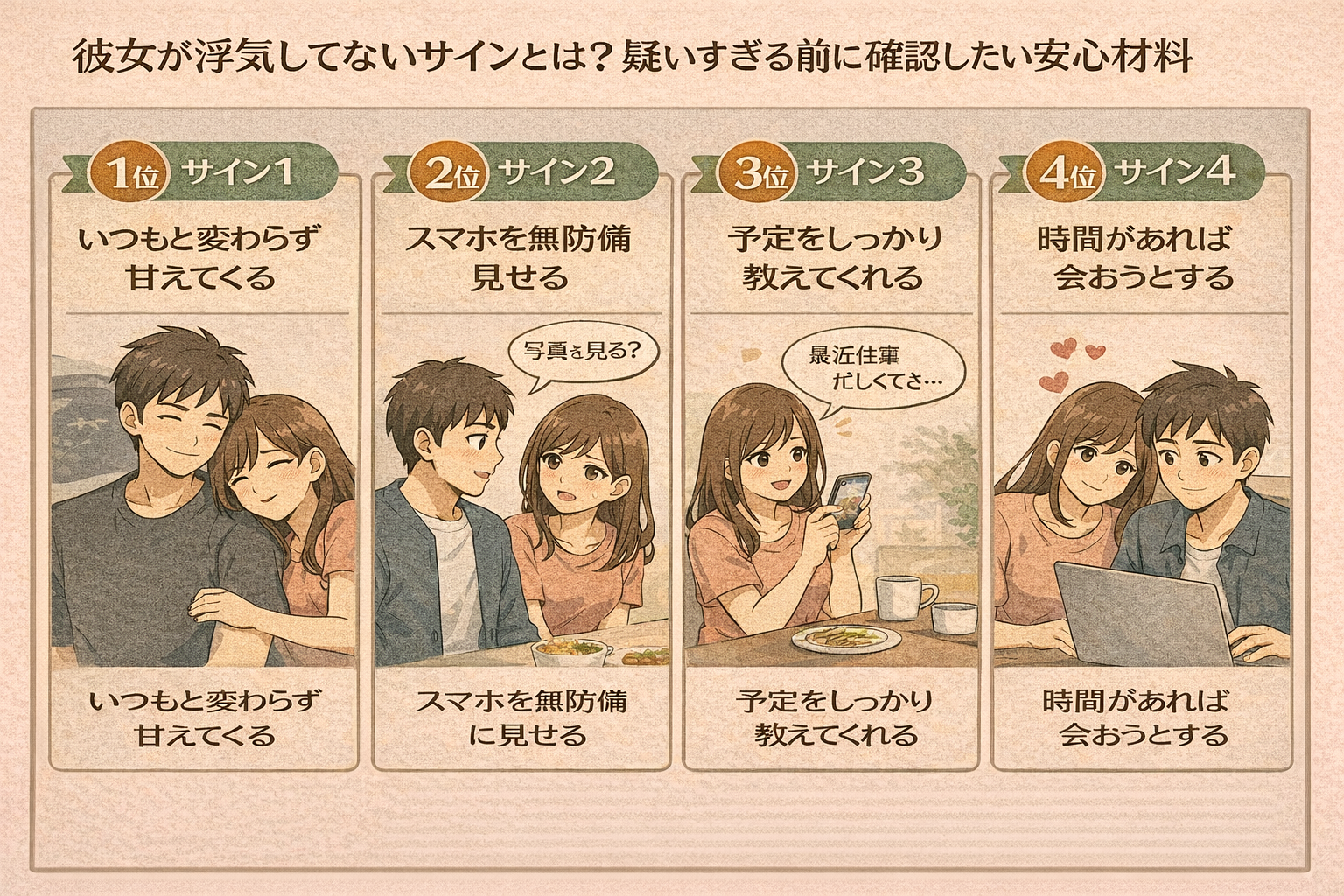 彼女が浮気していない場合に見られやすいサインを解説。質問に具体的に答える態度やスマホへの過剰な防衛がない点、連絡や感情の一貫性など、疑いを深める前に確認したい安心材料を冷静な視点でまとめています。