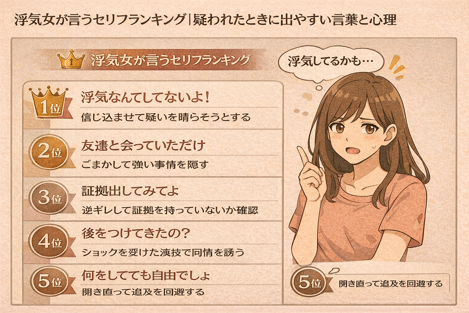 浮気女が言いがちなセリフをランキング形式で紹介。「なんで疑うの?」「ただの友達」「忙しいだけ」など、状況を曖昧にする言葉には共通した心理があります。セリフ単体で決めつけず、行動や使われる場面とあわせて冷静に見極めるポイントを解説します。