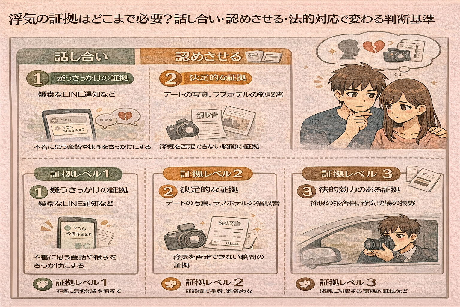 浮気を疑ったとき、多くの人が悩むのが「証拠はどこまで集めればいいのか」という点です。