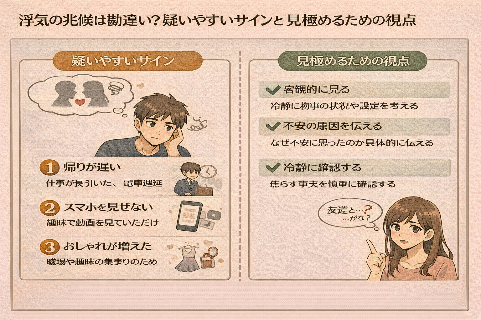 スマホを触る、一人の時間が増えたなど、浮気の兆候として語られがちな行動は勘違いの場合も少なくありません。なぜ疑いやすくなるのか、誤解しやすい代表例と冷静に見極めるための判断ポイントを分かりやすく解説します。