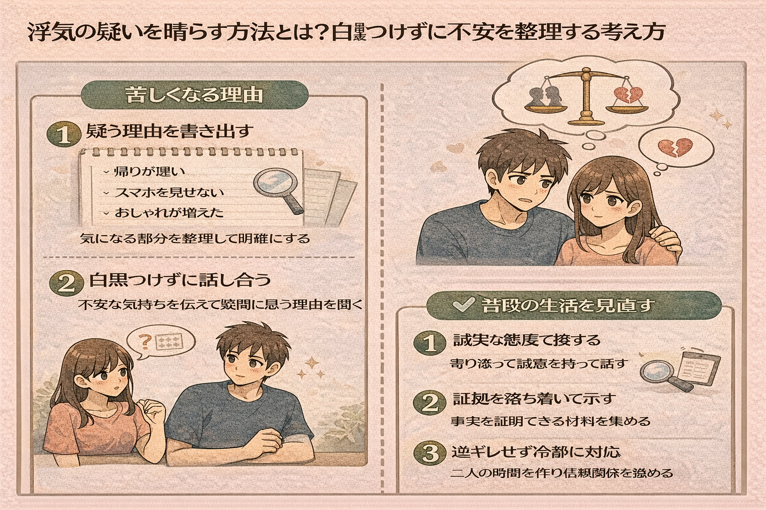 浮気の疑いを晴らしたいと感じたときは、無理に結論を出すより不安を整理することが重要です。事実と想像の切り分けや、一つの兆候に振り回されない視点、冷静に向き合うための現実的な方法を分かりやすく解説します。